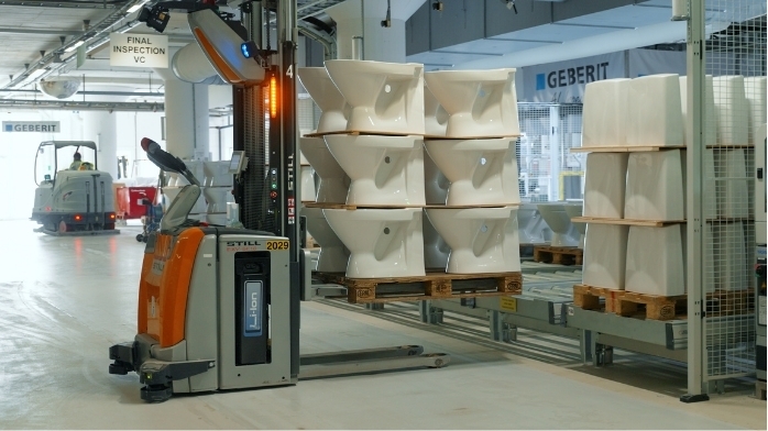 Geberit använder nu tolv skräddarsydda automatiserade truckar. Tillsammans med det nya systemet har de skapat ett stabilt transportflöde, förbättrad arbetsmiljö och ökad tillgänglighet.